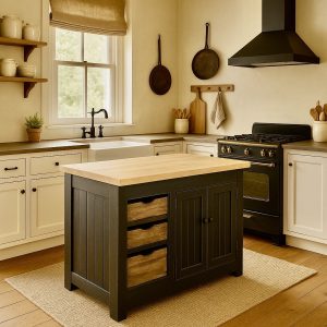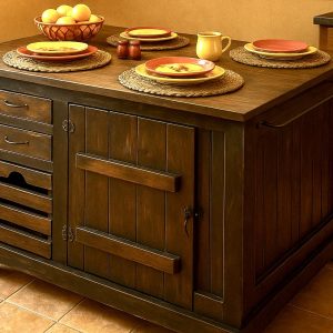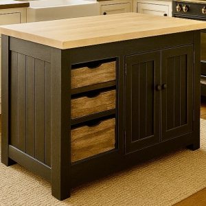Kitchen island designs, custom kitchen cabinets. This is a very beautiful and useful Farmhouse Industrial Kitchen Island with handy Roll out trash container. This one was built as a custom order for a client but we can build one for you. Its dimensions are 60″ x 24″ x 36″ tall. It has a 9″ overhanging eating bar which will accommodate three bar stools. We can build one for you any size, any color, with or without the industrial wheels. Contact us today to discuss cabinet configuration that works for you.