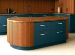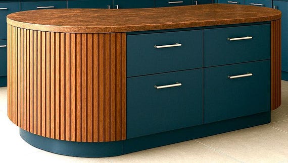 Ultra Contemporary hand built custom island with beautifully curved and fluted wood sides,back and 1.5 thick solid wood top. One double wide lower cabinet with a handy roll out tray and two large spacious drawers with slow close drawers and doors. Dimensions 74”x 36”x 36” tall.